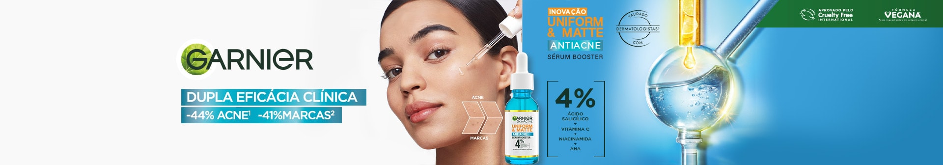 O novo Sérum Booster Antiacne com 4% de concentração [Vitamina C + Ácido Salicílico + Niacinamida + AHA] para combater a acne e reduzir marcas ao mesmo tempo.